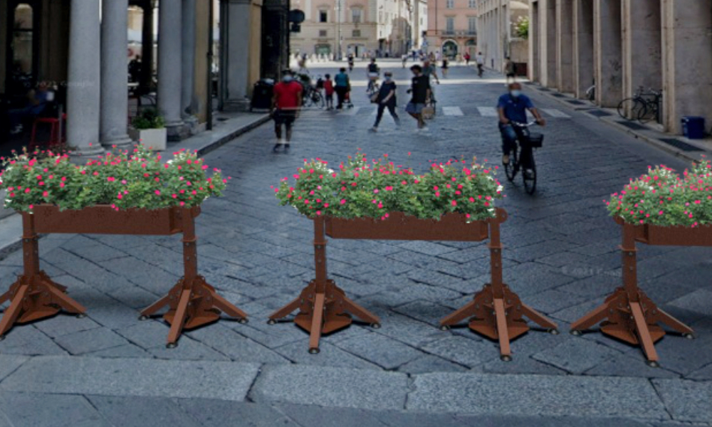 Esempio di affiancamento di due o tre manufatti TEC-CLS 3 per la chiusura di carreggiate di medie e grandi dimensioni. Il manufatto, con finiture di pregio, presonalizzabili, è dotato di due fioriere